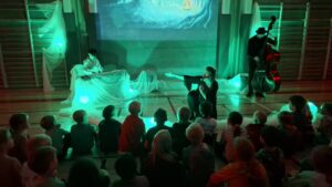 Það stóð ekki öllum á sama í morgun þegar hálf draugalegir jazztónar hljómuðu í myrkviðum íþróttasalnum í morgun. Þangað voru krakkarnir á yngsta stigi mættir til þess að hlusta á þrjá drauga spila, syngja og segja sögur.