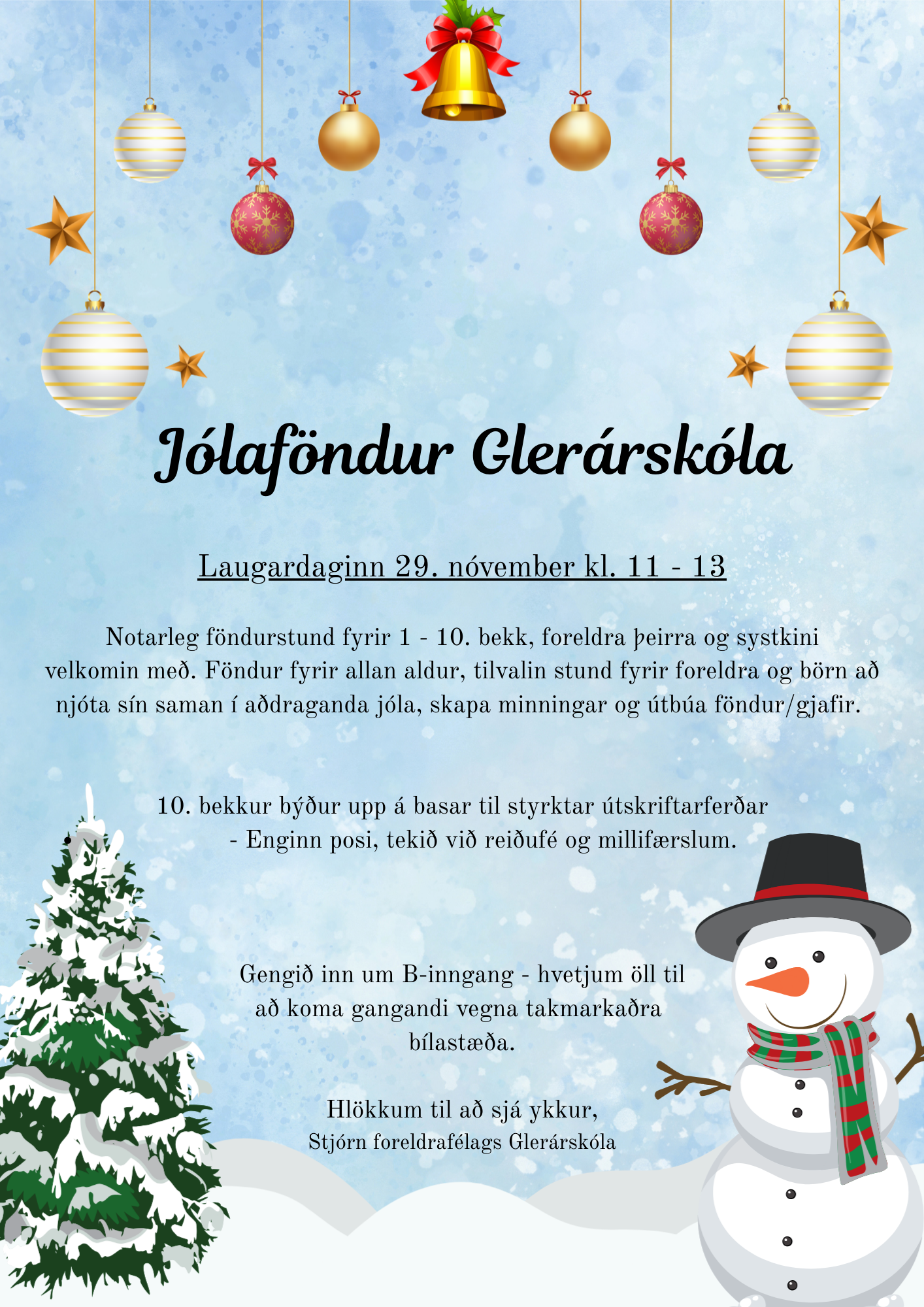Laugardaginn 29. nóvember kl. 11 – 13 verður notalega föndurstund fyrir 1. – 10. bekk foreldrar og systkini velkomin með krökkunum. Boðið verður upp á föndur sem hentar öllum aldursstigum. Þetta er tilvalin stund fyrir foreldra og börn að njóta samveru í aðdraganda jóla, skapa minningar og útbúa föndur og gjafir.