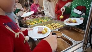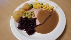 Kennslu lauk á hádegi í dag en áður en haldið var heim var boðið upp á sannkallaðan jólamat, hamborgarhrygg með brúnuðum kartöflum, sósu og hefðbundnu meðlæti.