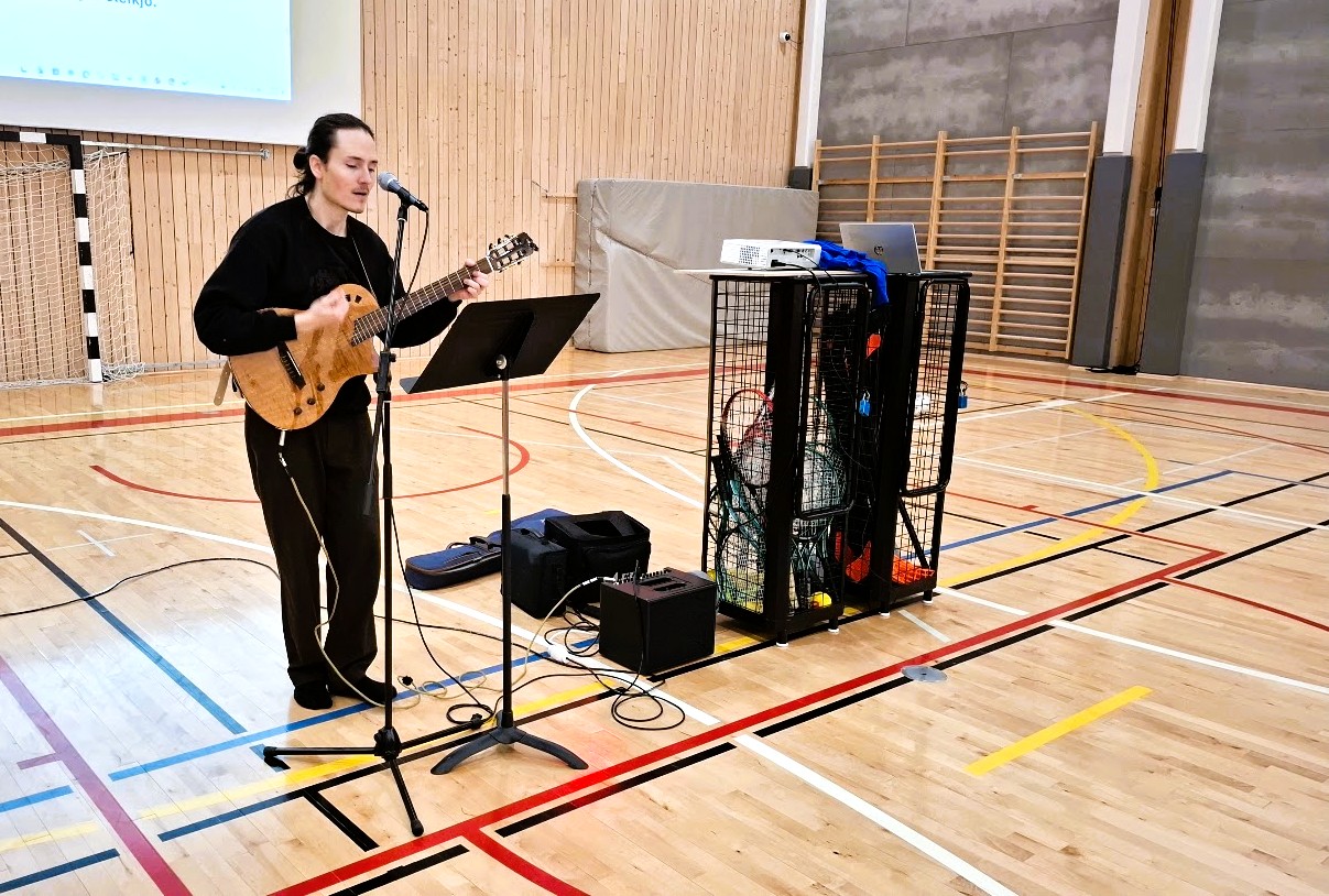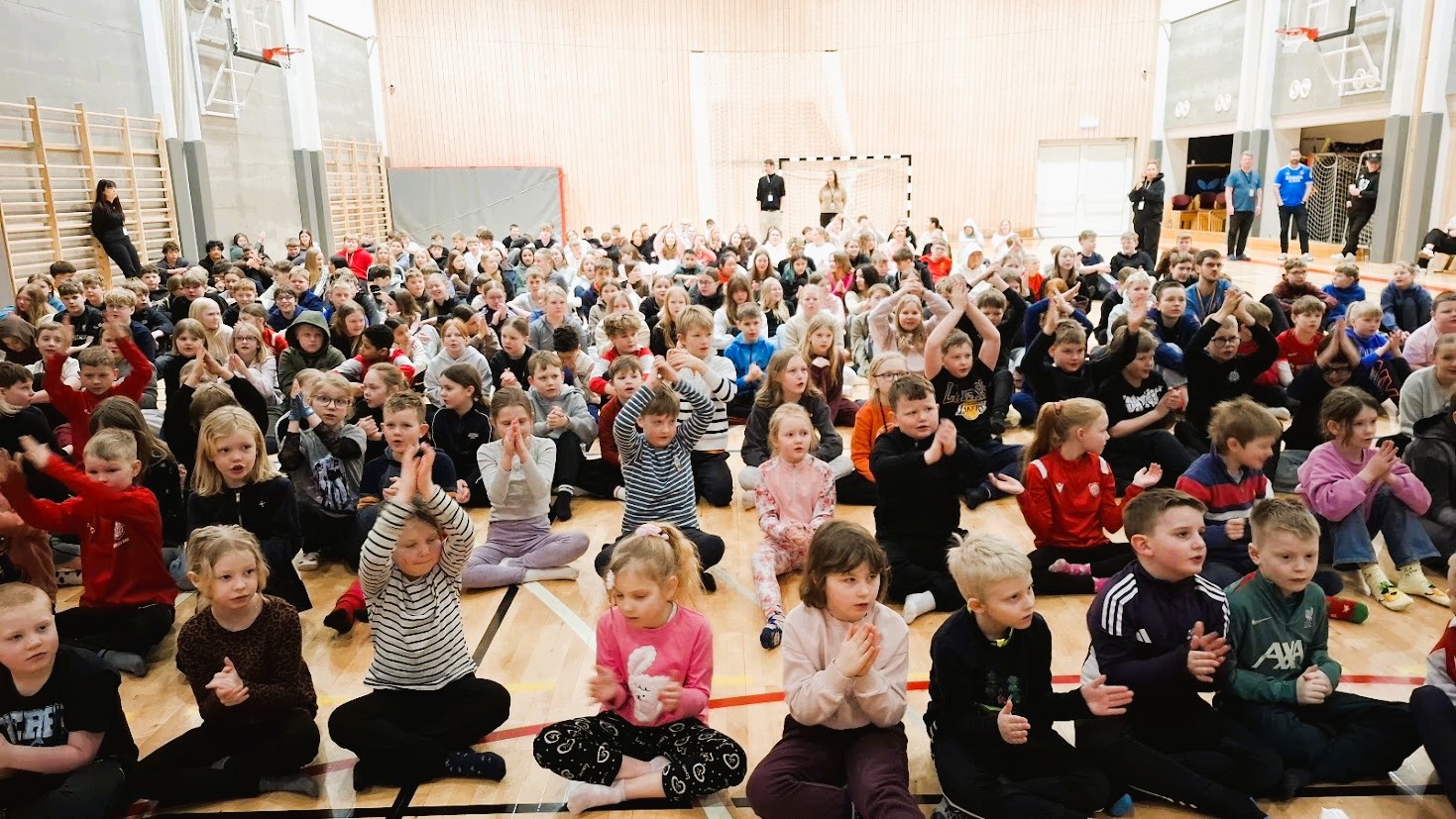 Nemendur fylltu íþróttahúsið okkar og tóku hressilega undir með Ivani sem leiddi sönginn af mikilli fagmennsku. Byrjað var á Glerárskólasöngnum áður en hópurinn kyrjaði Þorparann sem Pálmi Gunnarsson gerði ódauðlegt hér um árið. Þá var komið að Þúsund hjörtum, lagi MC Gauta og að síðustu var, Lagið um það sem er bannað, sungið af mikilli innlifun.